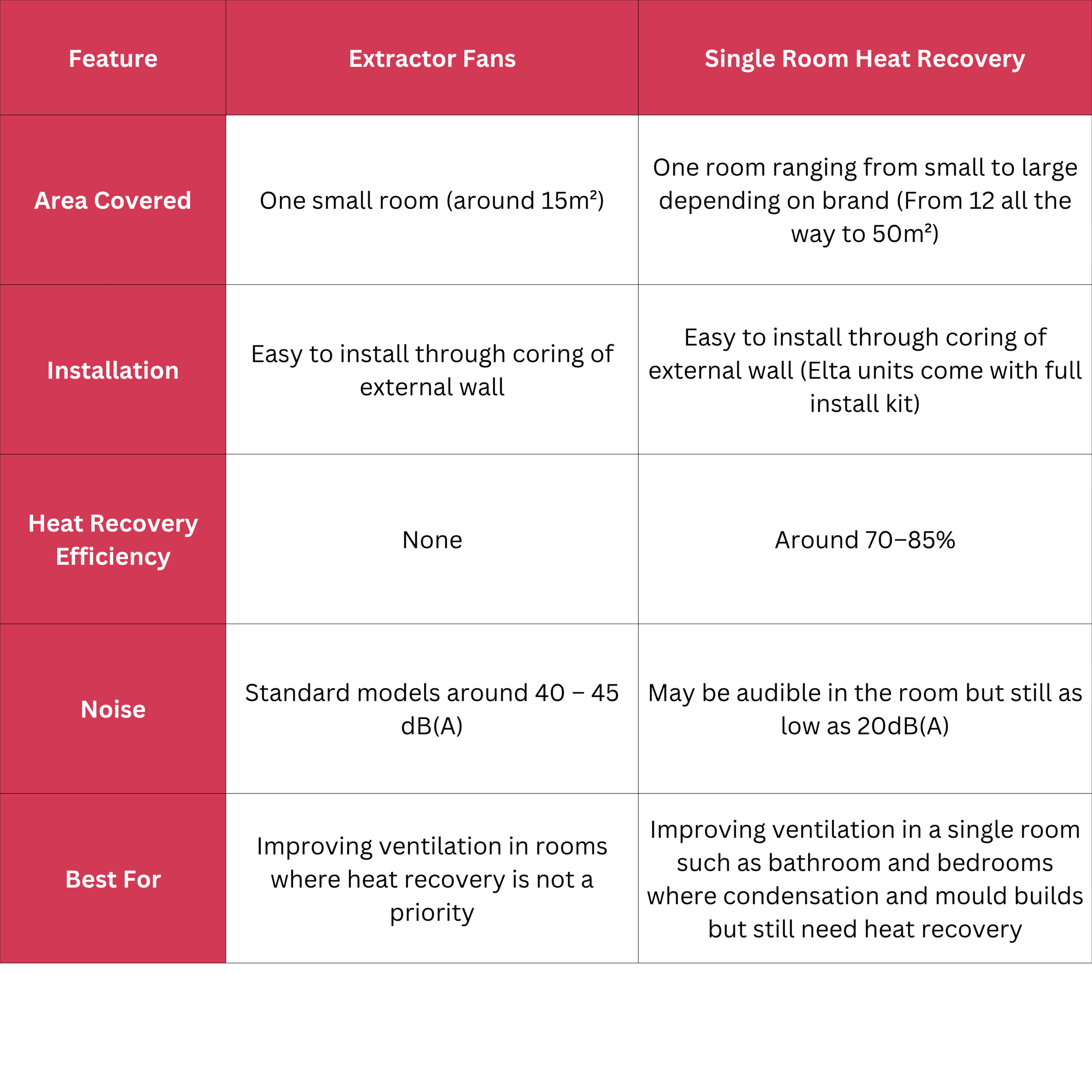 Traditional ventilation like bathroom and kitchen fans lets heat escape and causes drafts. With condensation, damp and mould common in bathrooms, bedroomrs, and kitchens, single room heat recovery offers a cost effective and energy efficient solution for homes. Single room heat recovery units can be installed in all types of homes, typically in retrofit where a home can’t accommodate central ventilation systems that require ducting.